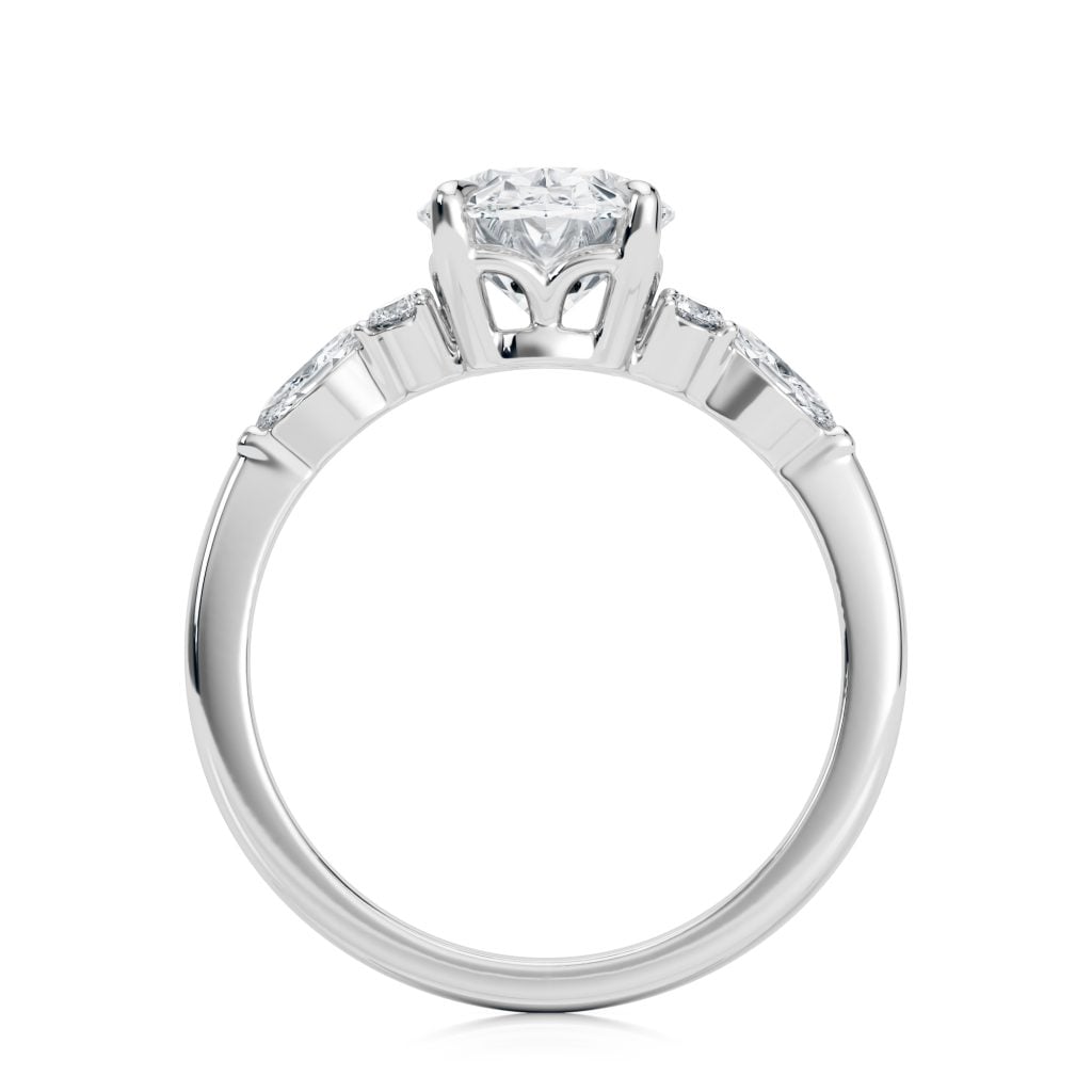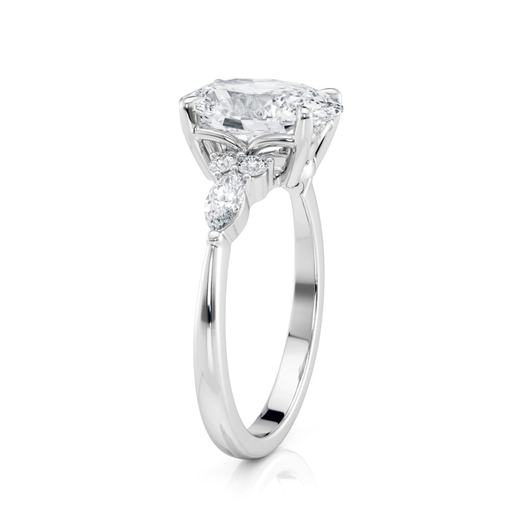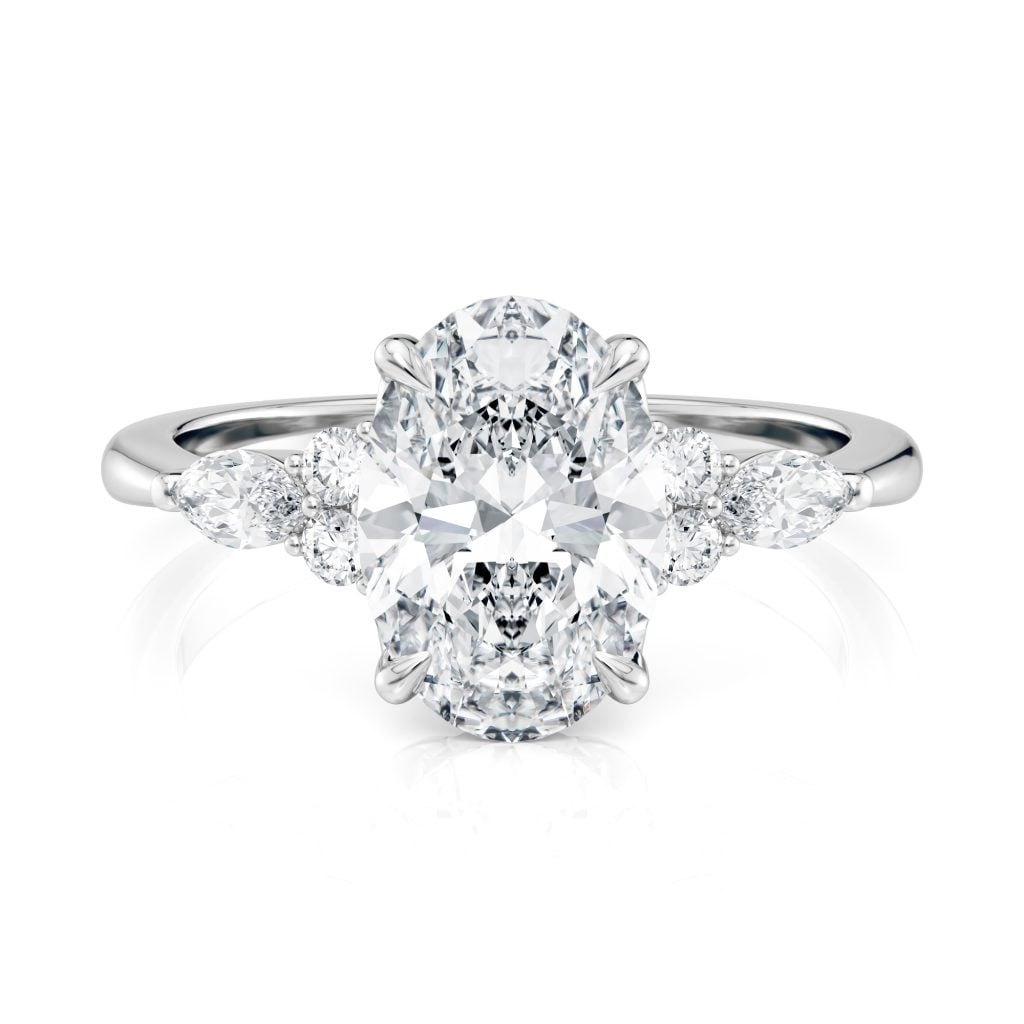 Oval engagement ring setting with marquise and round brilliant side stones in a delicate cluster design. Open gallery for added brilliance and a slim band that keeps the focus on the center diamond.