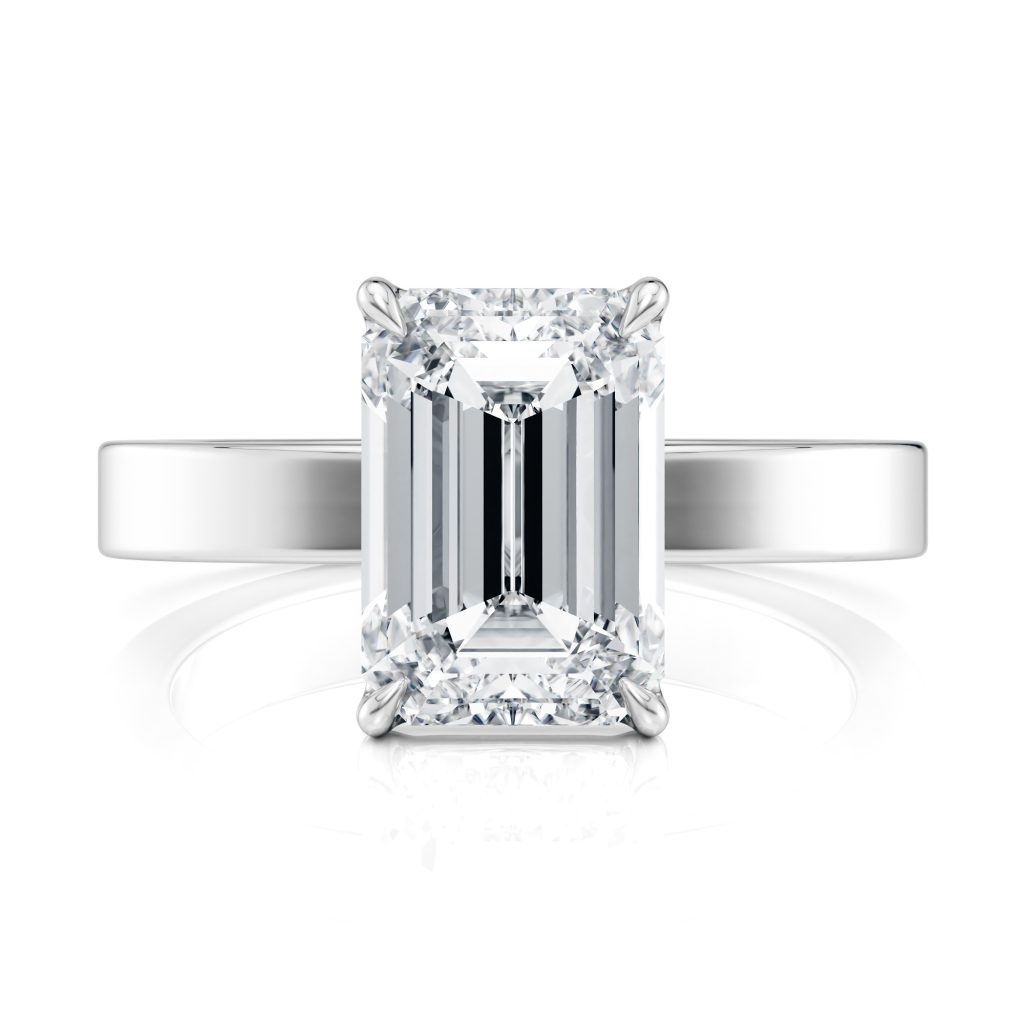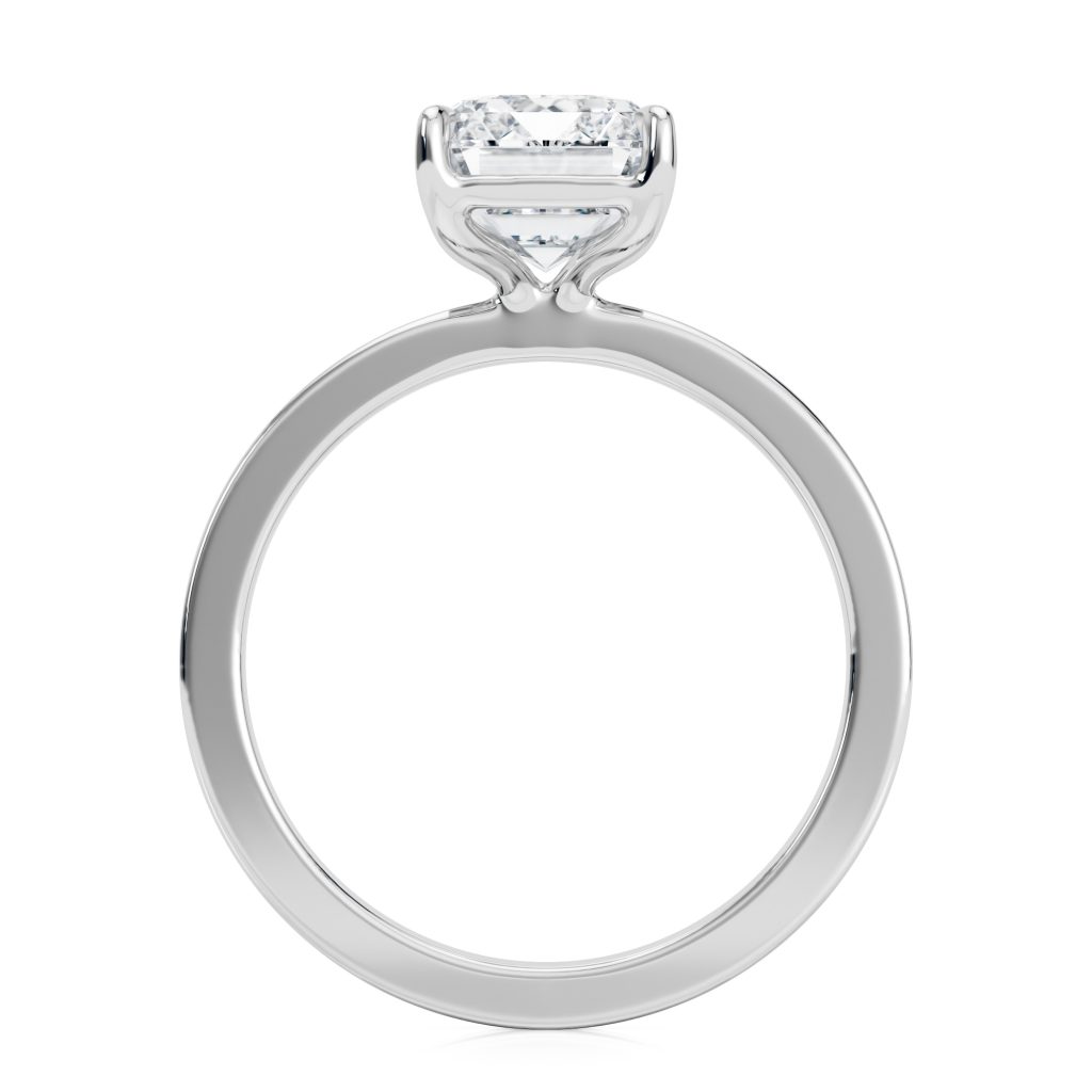 A modern solitaire design featuring a sleek cigar band and refined four-prong setting, thoughtfully crafted to sit flush with wedding bands. Minimal, bold, and timelessly elegant.