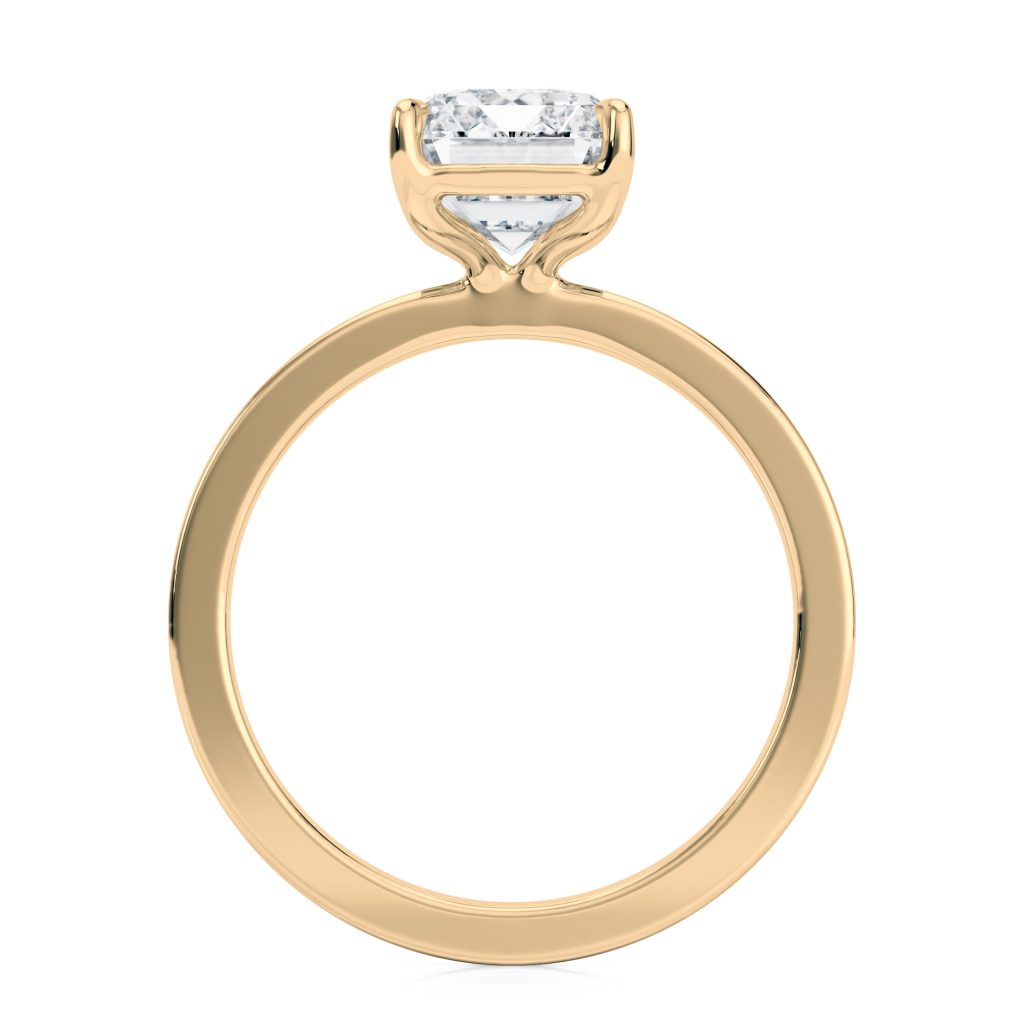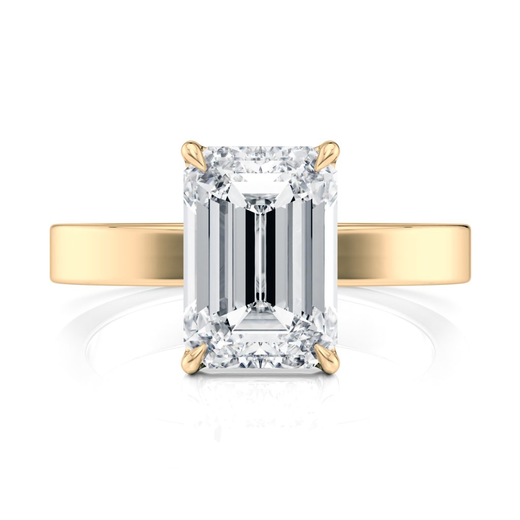 A modern solitaire design featuring a sleek cigar band and refined four-prong setting, thoughtfully crafted to sit flush with wedding bands. Minimal, bold, and timelessly elegant.